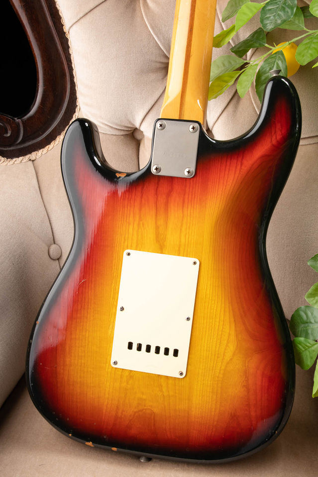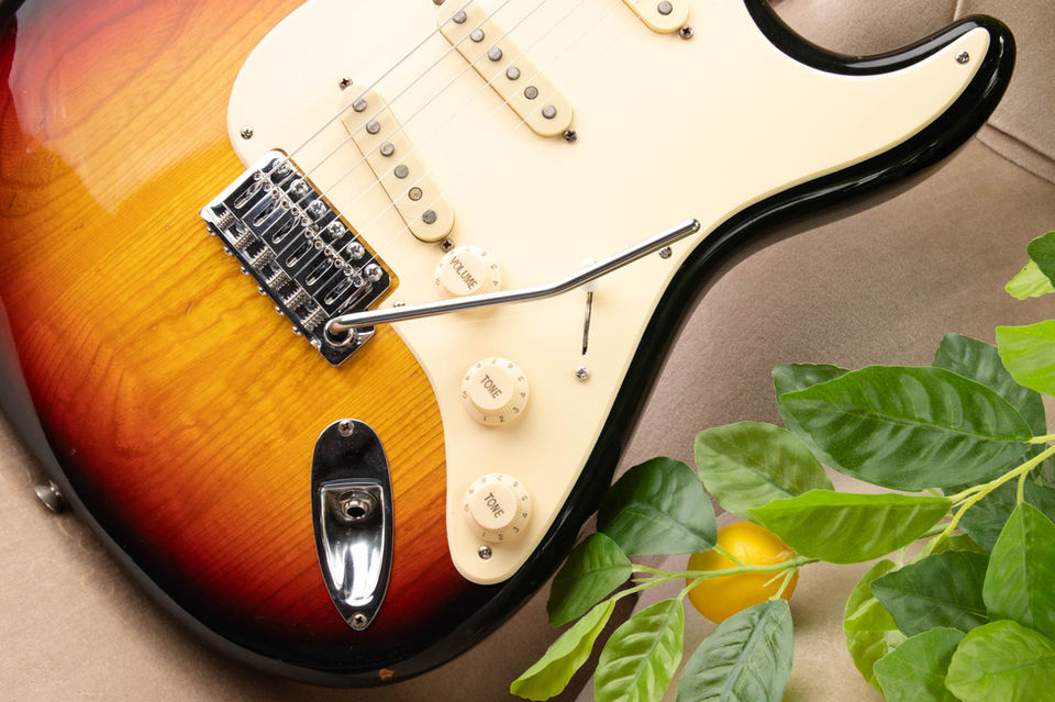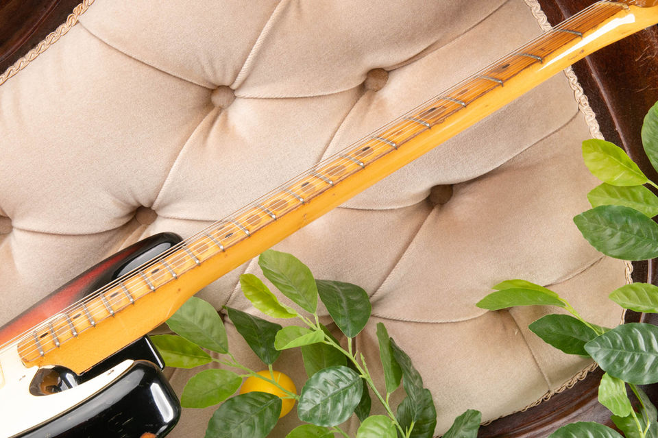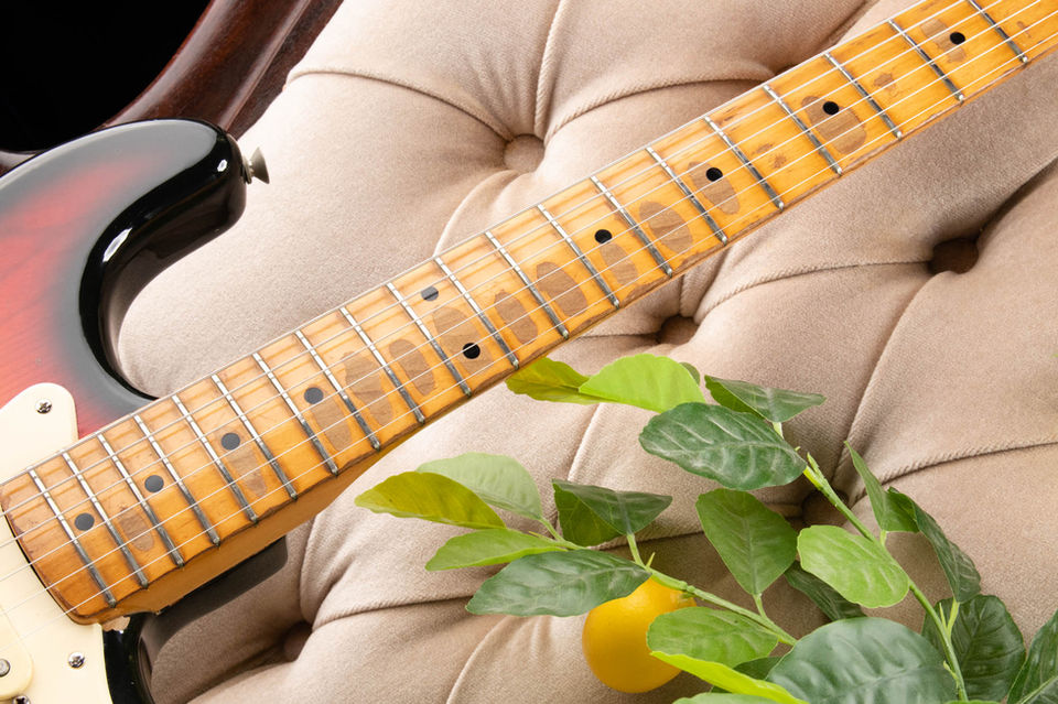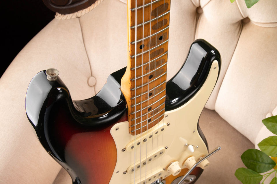 When the guitar arrived into UK from Japan, it was looking tired - exhausted would be a better description. The board wear and parking knocks are never an issue, but the cracked and broken pick-guard, the sweat-eroded and seized saddles and tuners had obviously spelled out 'final retirement'. But removing the worn out hardware and a gentle clean revealed that this guitar should and will go on for many years to come.