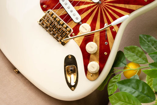 Starting with a fine solid 1978 Matsumoku built Aria Stagecaster, and looking for an excuse to use a splendid looking scratchplate, I rather went to town on this one. Starting with the hardware, the already fine tremolo bridge was replaced with a Gotoh GE-101TS in Gold with the lovely stainless block, a set of aged gold SD-91 tuners replaced the original ones, and matching gold jack plate and strap buttons gave me the general look - we were pleased with it.