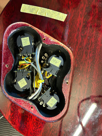 Only CTS pots are used - we can work with skinny bodied guitars - even SG's have been achieved. No silliness with mega-bucks BumbleBee caps unless you have the budget for it - there is not a lot of room in the cavity for all this wizardry - stick to Sozo, it will sound the same.