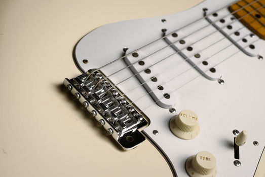 This is a pancake construction as normal for this era of Matsumoku production - the white paint has faded to cream (matching the TE-350) but retains a lustre usually missing from guitars of this age. It has been cherished. By this time, Matsumoku was fitting a more accurate version of the vintage style tremolo, and producing them at 25.5" scale unlike many of the earlier versions which are slightly shorter in scale and have the earlier bridge design.