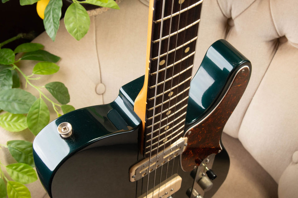 Ordered by the previous owner to his ideal specification, this is a British Racing Green finish, and the darker hue similar to the Williams Grover Bugatti, rather than the D-types and Blower Bentleys. The light catches it and gives it an almost Kingfisher emerald sparkle. The Alder body has the upper body Strat-like contouring and belly cut which makes this such a comfortable guitar to play sitting or standing.